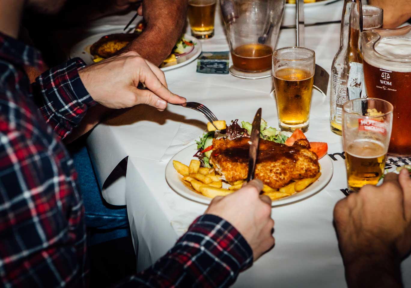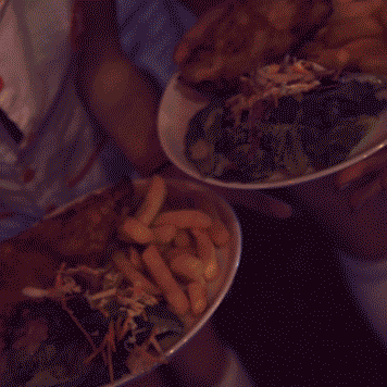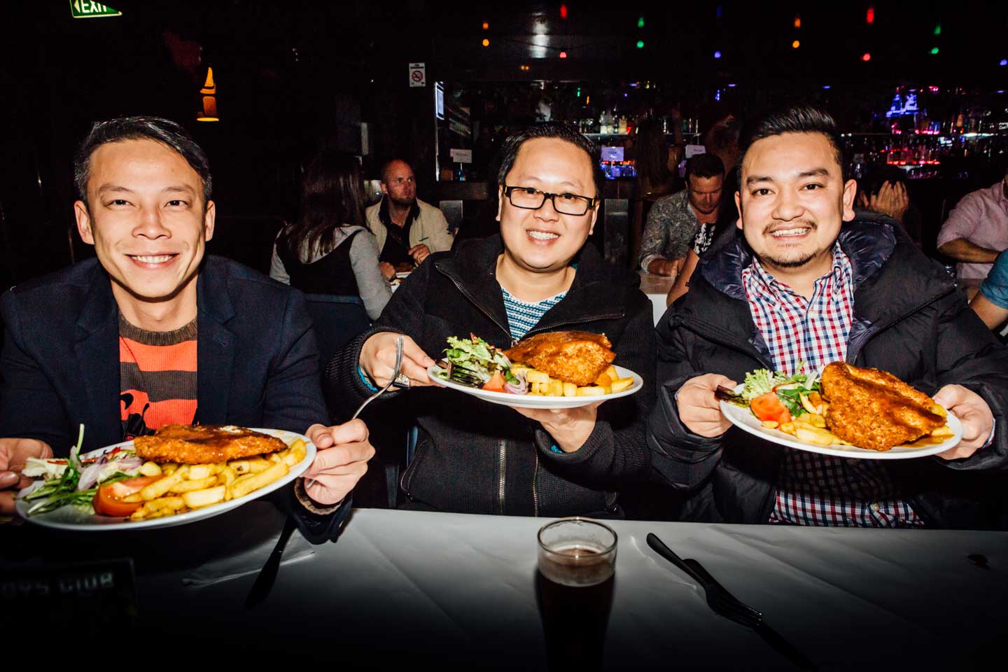 Chicken or eggplant schnitzel is served with crispy chips, garden fresh salad and your choice of sauce to keep your strength up for the night ahead.